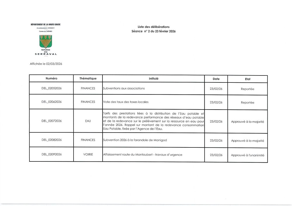 Vous êtes ici : Accueil > Vie municipale > Conseil Municipal > Les séances du conseil municipal depuis le 1er juillet 2022 > 2026 > 23 FEVRIER 2026 > DELIBERATIONS